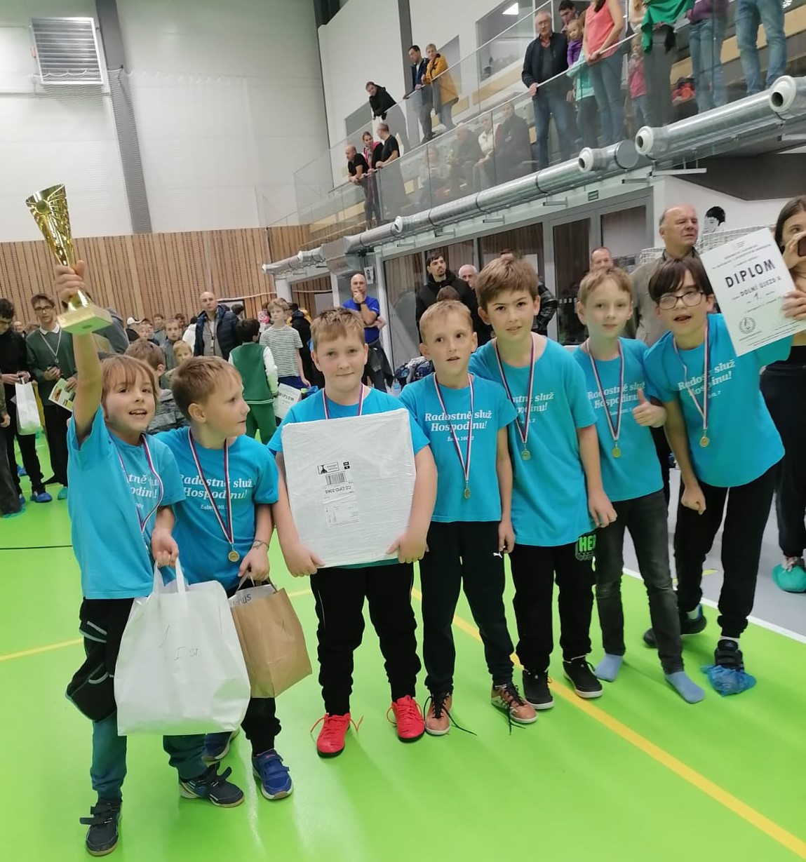 Vyrazili jsme v pátek večer, přespali na faře v Telnici (díky o. Oldřichovi a F. Kroutilovi) a v sobotu soutěžili. Mladší kluci byli překvapeni molitanovým míčem na fotbal, s kterým běžně netrénují, přesto prohráli jen jeden z osmi zápasů. Z teoretického testu měli nejlepší průměr ze všech. Při vyhlašování výsledků jsme mysleli, že na nás zapomněli, a první místo vyvolalo v našich tvářích obrovskou radost. Nádherný zážitek, odvážíme si zlatou trofej. Příští rok samozřejmě jedeme zas!